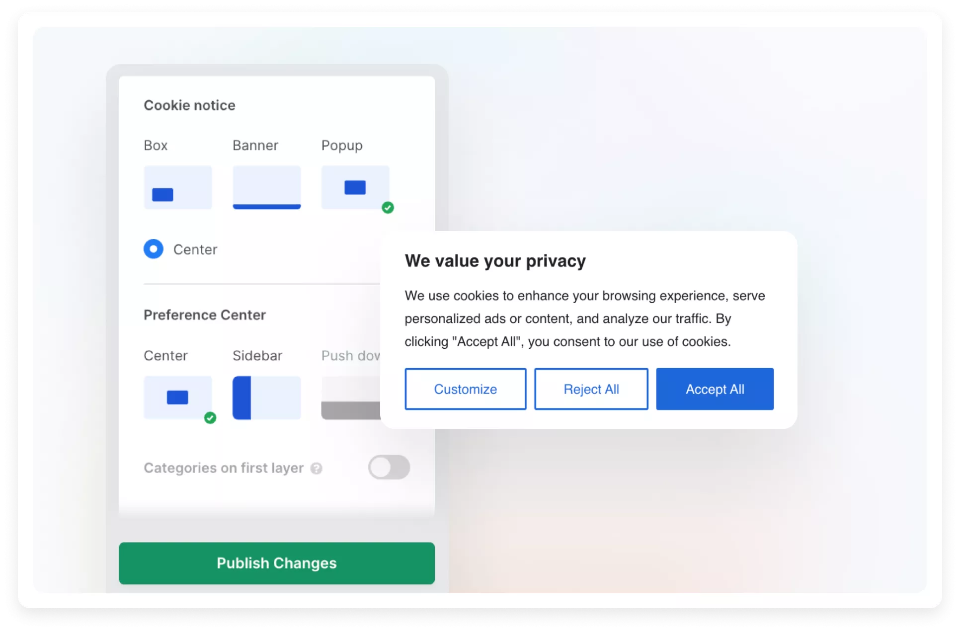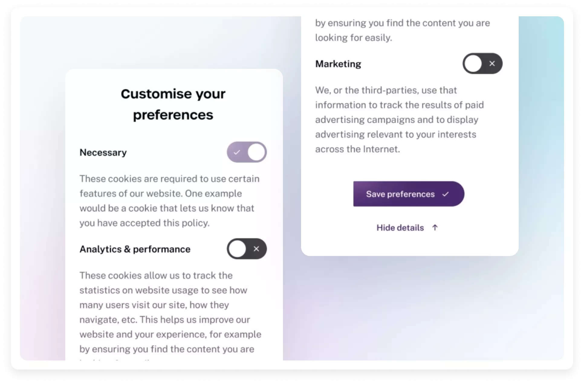 Übernehmen Sie die Kontrolle über die Cookie-Nutzung auf Ihrer Website mit unseren anpassbaren Cookie-Kategorien. Passen Sie Ihre Cookie-Strategie an Ihre speziellen Anforderungen an, indem Sie Cookie-Kategorien auswählen, konfigurieren und verwalten.